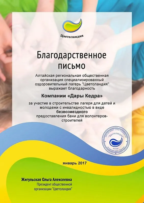 Благодарим компанию «Дары Кедра» за шикарный подарок - кедровую баню-бочку для строителей-волонтеров лагеря для детей с инвалидностью «Цветоландия». В конце 2016 года мы обратились к руководству компании и они пошли нам навстречу, за что от волонтеров, детей, родителей команды лагеря - ОГРОМНОЕ СПАСИБО! Компании, которые думают об окружающих их людях, помогают им - достойны уважения. Дары Кедра + Цветоландия = друзья forever!