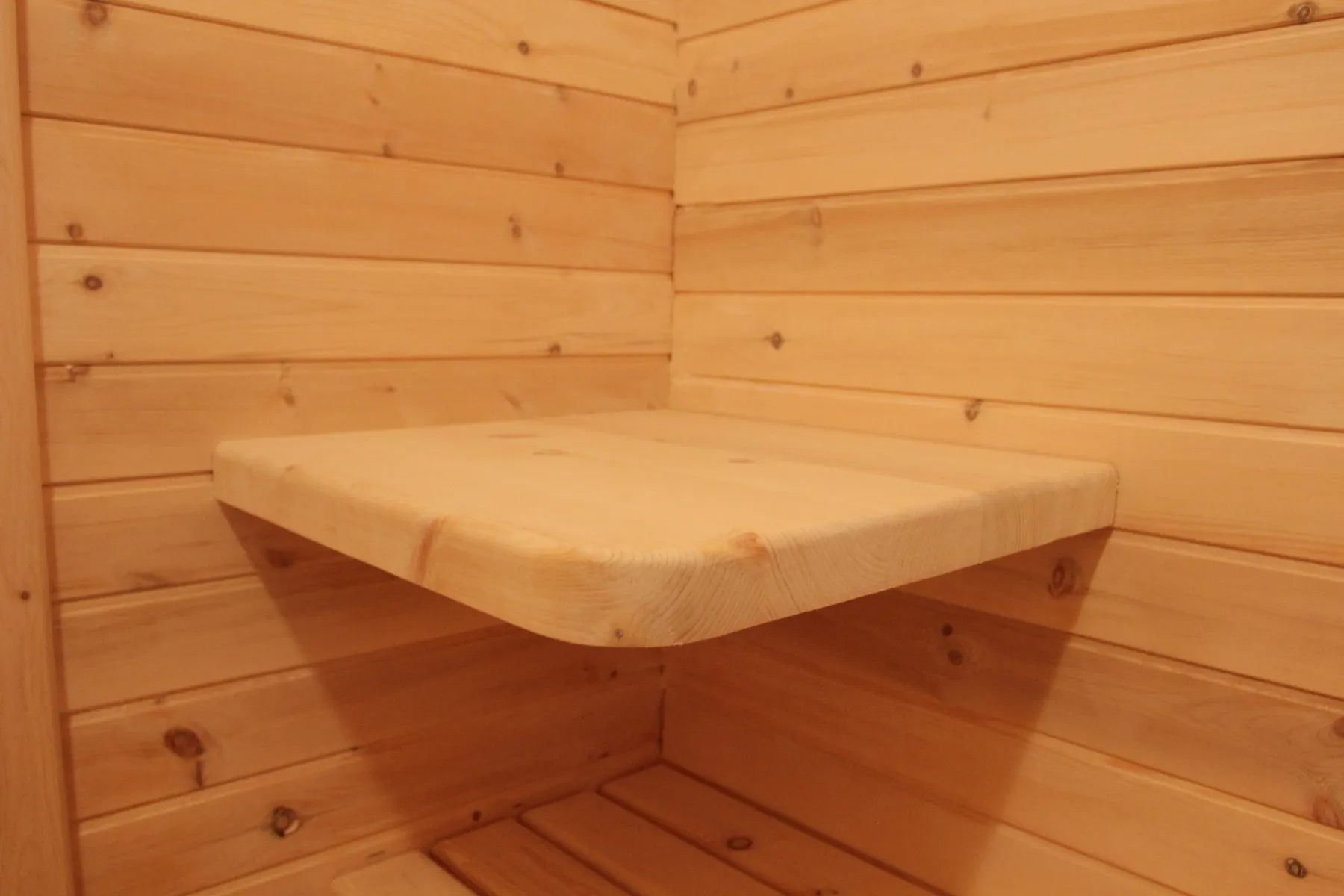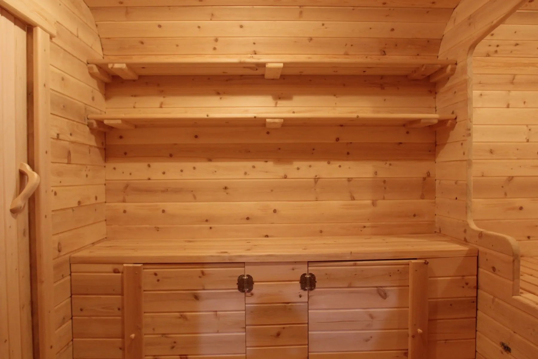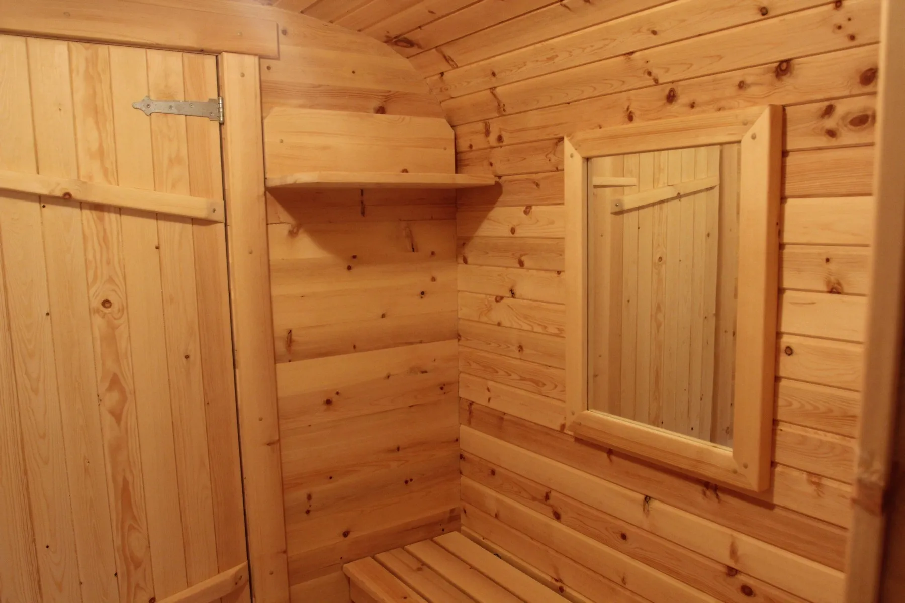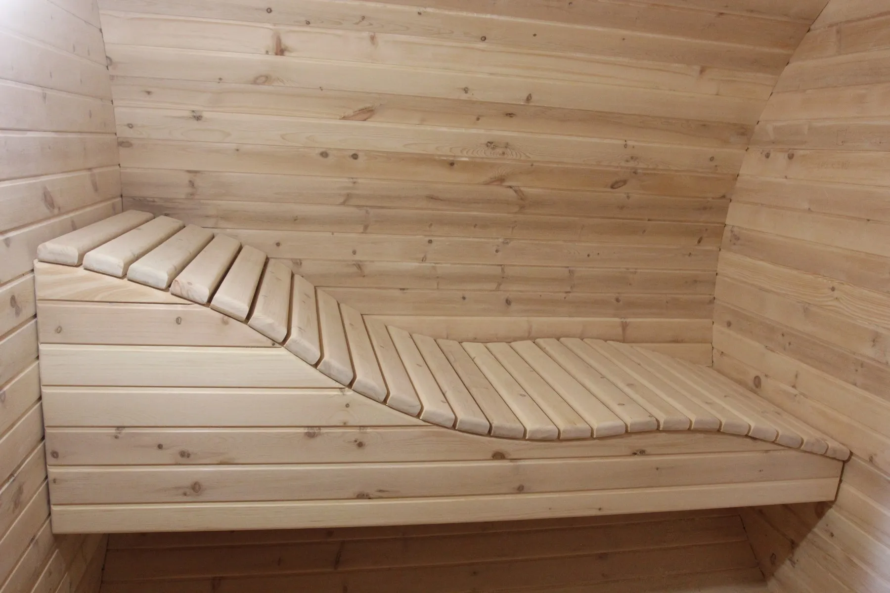 Это более просторная модель за счет увеличенной высоты потолков и ровного пола. В такой модели раздевалка совмещена с моечной. Тут установлен душевой поддон, вешалка, полочка и лавочка из кедра. В парильном отделении по обе стороны расположены двухуровневые открытые полки, печь находится между ними у дальней стены. Время растопки такой бани не превышает 30 минут. По вашему желанию баню-бочку можно укомплектовать козырьком, верандой и печью с внешней загрузкой, благодаря которой весь мусор во время топки остается на улице. Баня-бочка буханка не требует полноценный фундамент, поэтому при необходимости ее можно перенести в другое место.