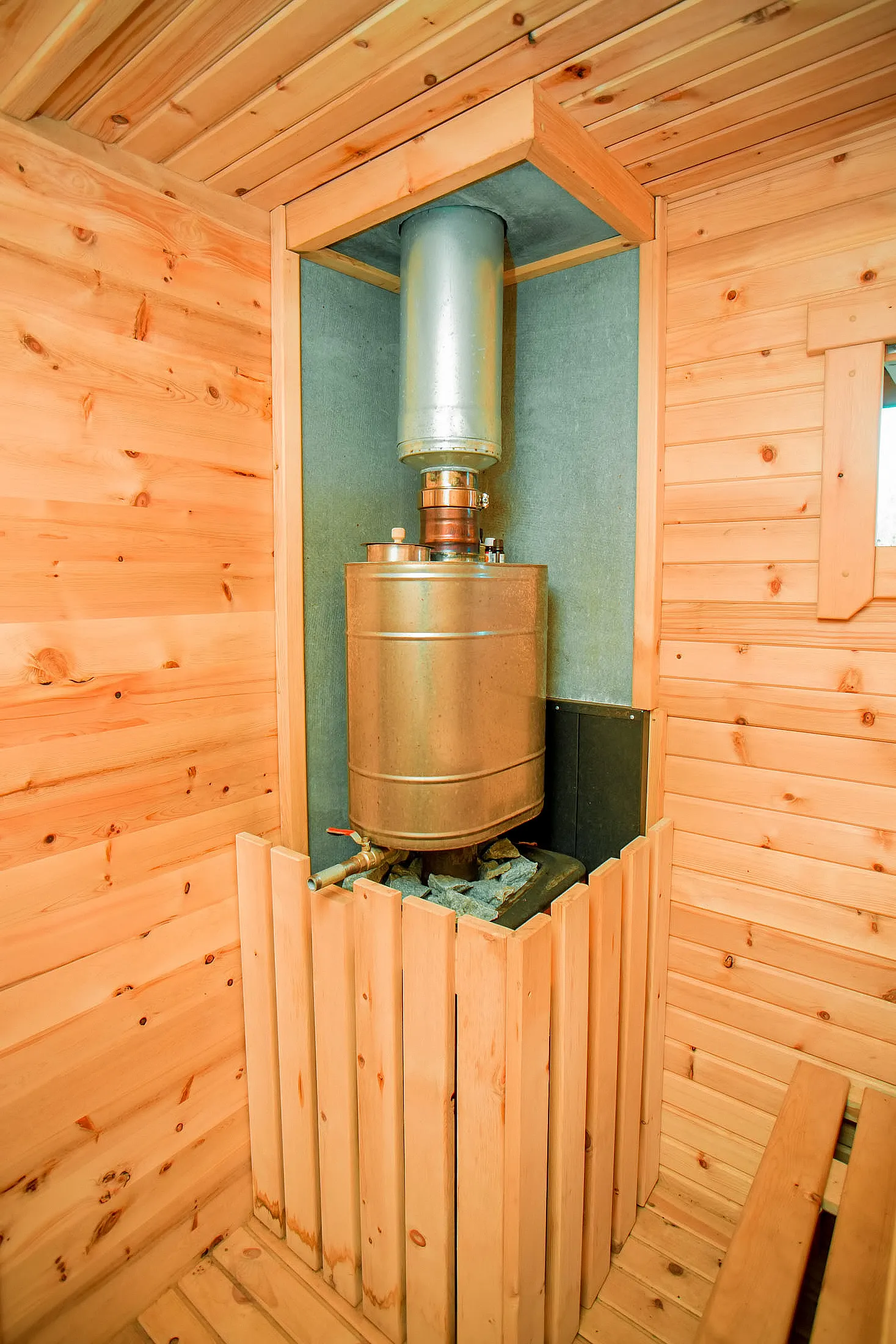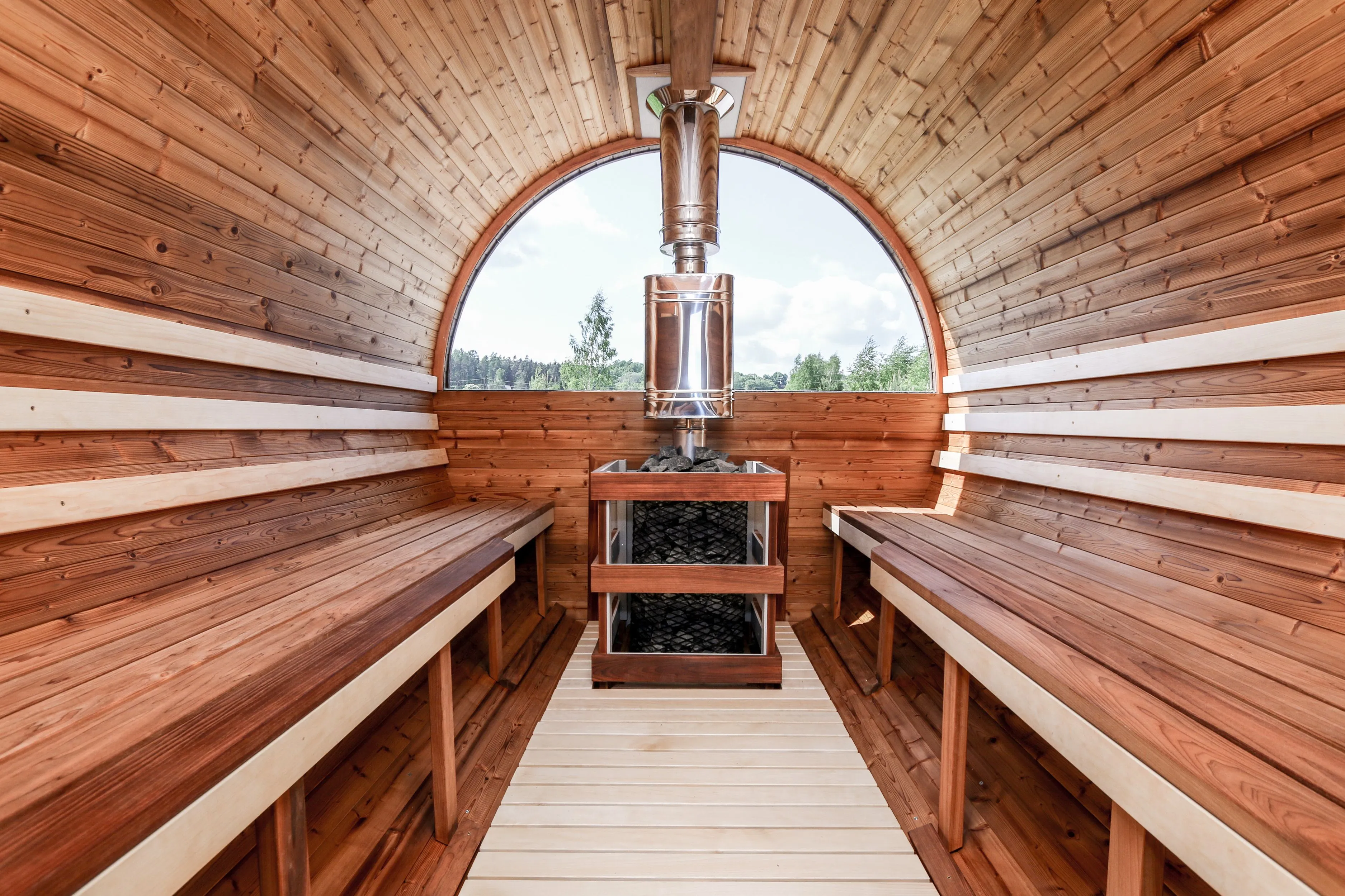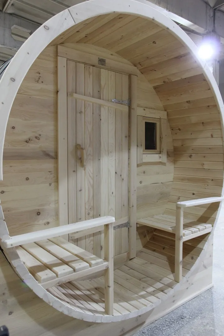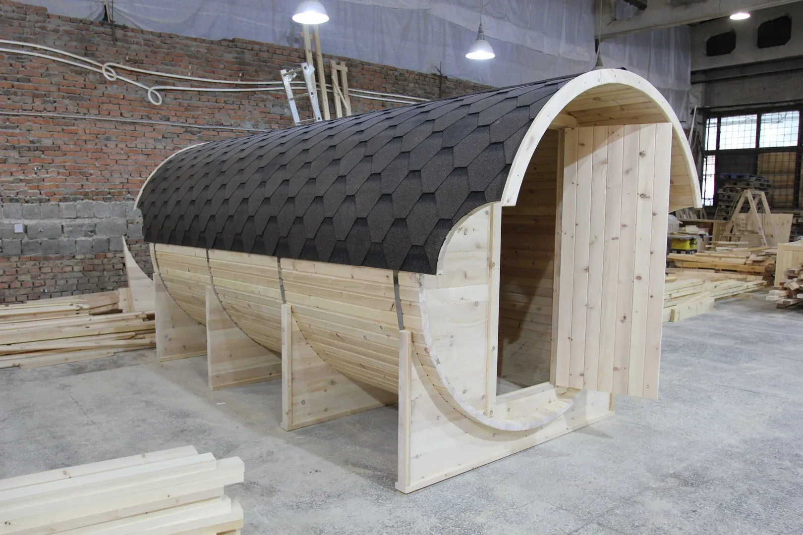 Это более просторная модель за счет увеличенной высоты потолков и ровного пола. В такой модели раздевалка совмещена с моечной. Тут установлен душевой поддон, вешалка, полочка и лавочка из кедра. В парильном отделении по обе стороны расположены двухуровневые открытые полки, печь находится между ними у дальней стены. Время растопки такой бани не превышает 30 минут. По вашему желанию баню-бочку можно укомплектовать козырьком, верандой и печью с внешней загрузкой, благодаря которой весь мусор во время топки остается на улице. Баня-бочка буханка не требует полноценный фундамент, поэтому при необходимости ее можно перенести в другое место.