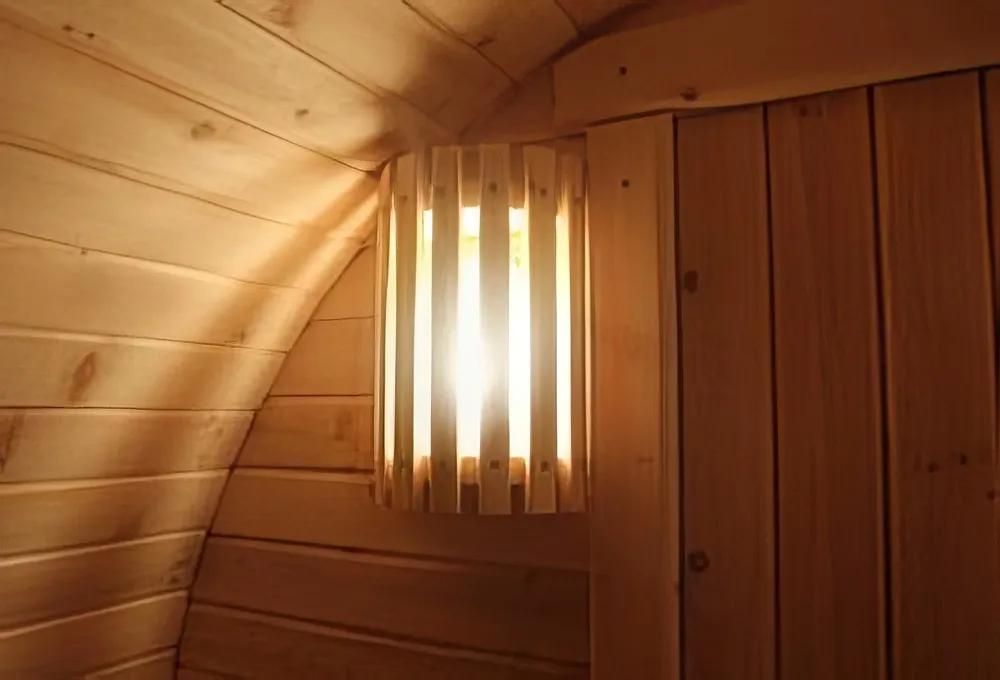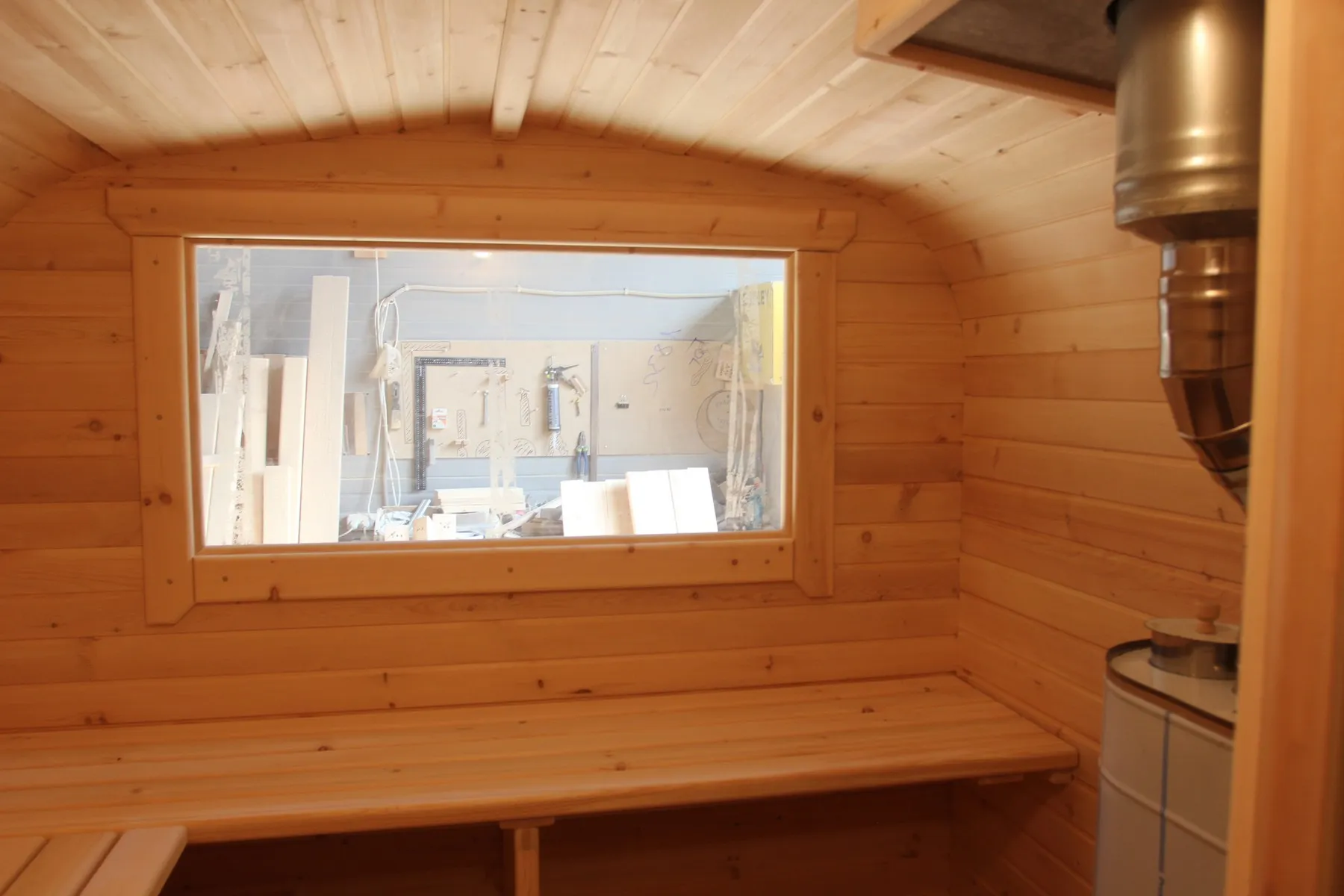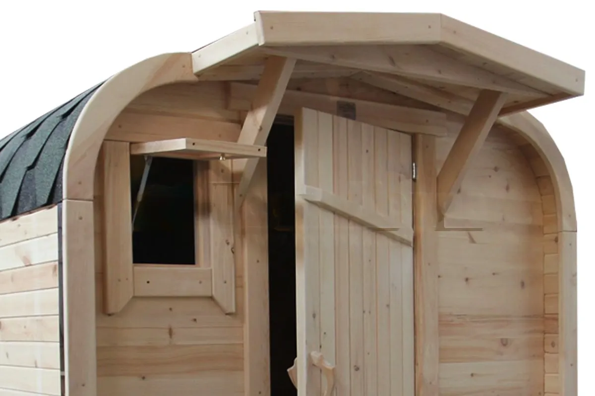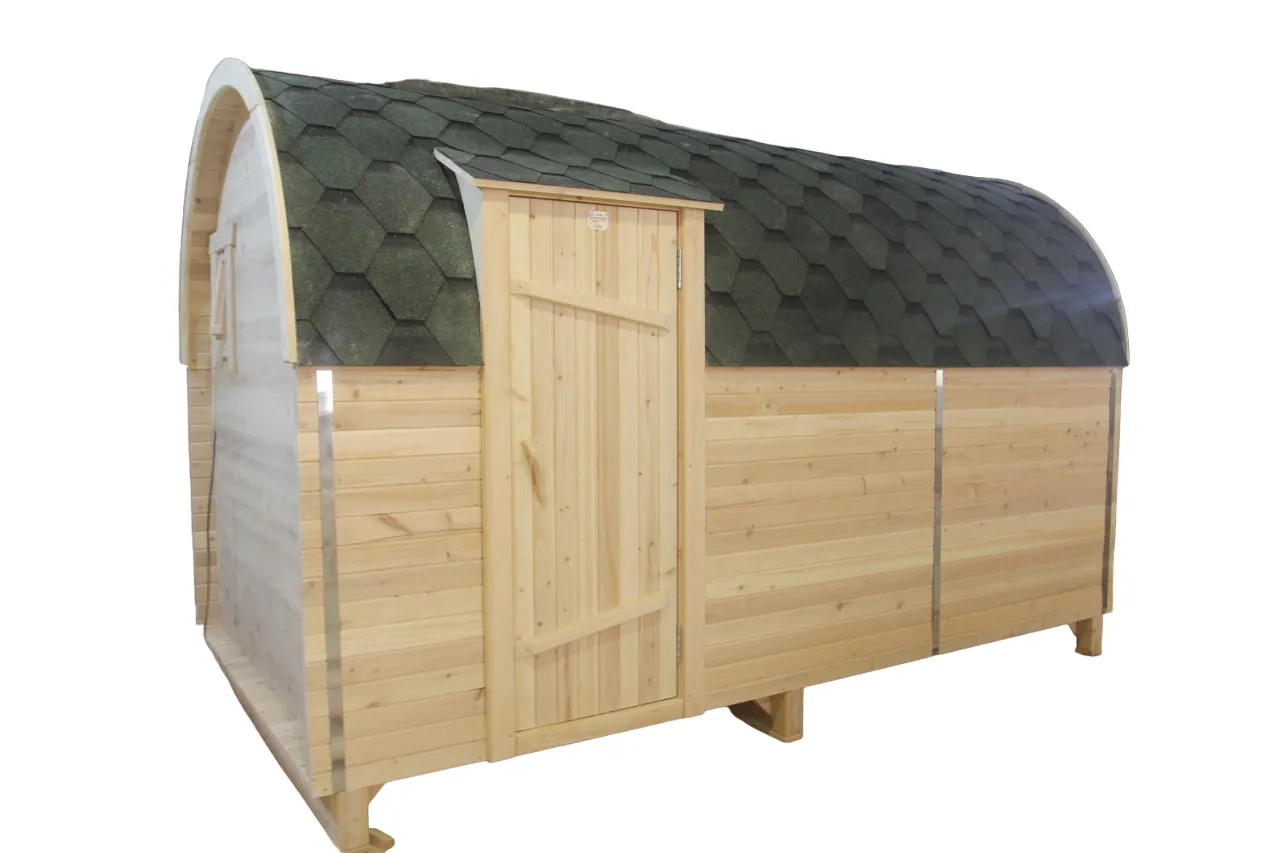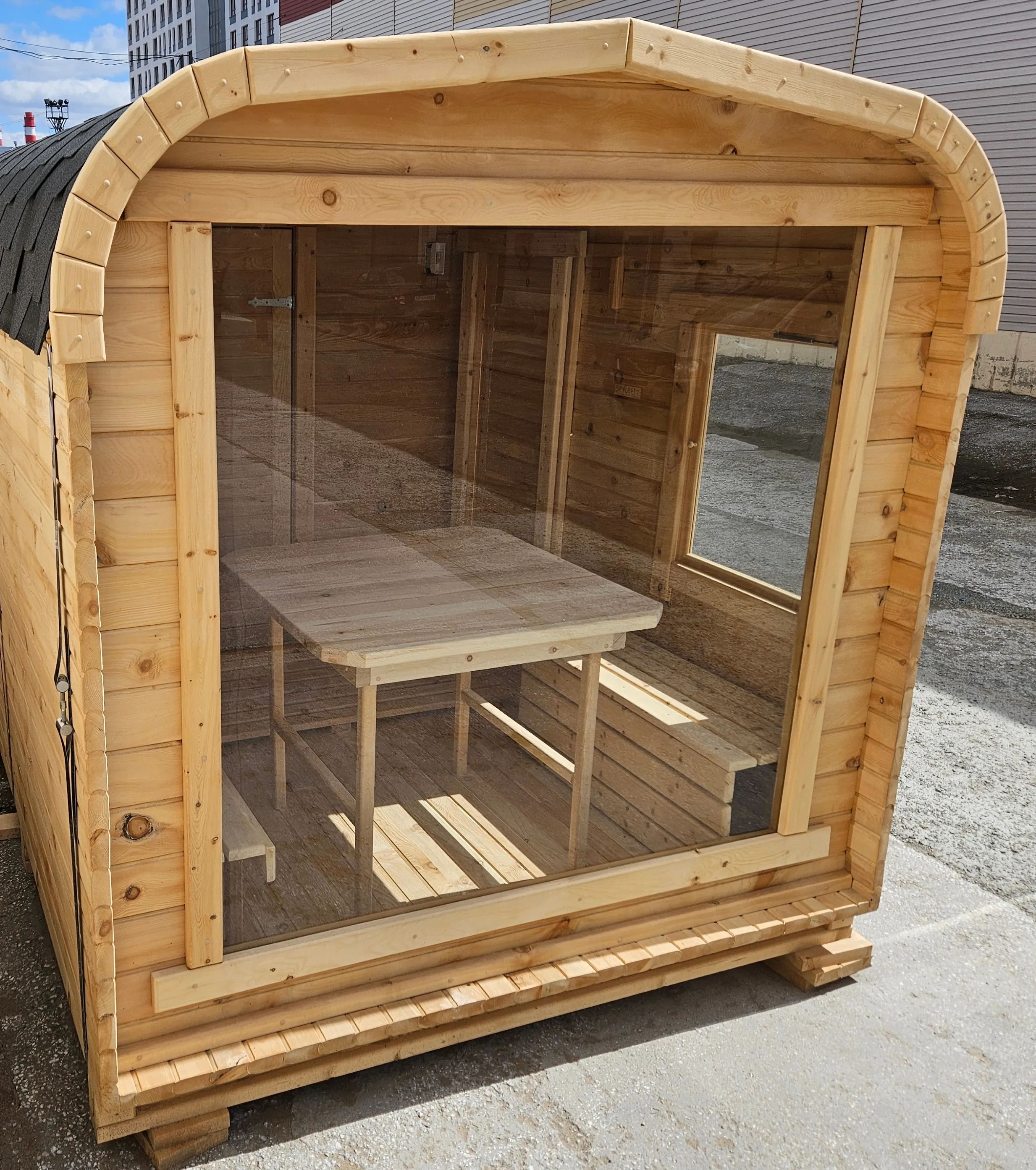 Это более просторная модель за счет увеличенной высоты потолков и ровного пола. В такой модели раздевалка совмещена с моечной. Тут установлен душевой поддон, вешалка, полочка и лавочка из кедра. В парильном отделении по обе стороны расположены двухуровневые открытые полки, печь находится между ними у дальней стены. Время растопки такой бани не превышает 30 минут. По вашему желанию баню-бочку можно укомплектовать козырьком, верандой и печью с внешней загрузкой, благодаря которой весь мусор во время топки остается на улице. Баня-бочка буханка не требует полноценный фундамент, поэтому при необходимости ее можно перенести в другое место.