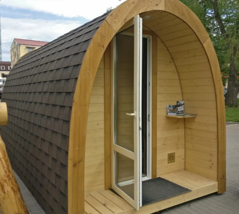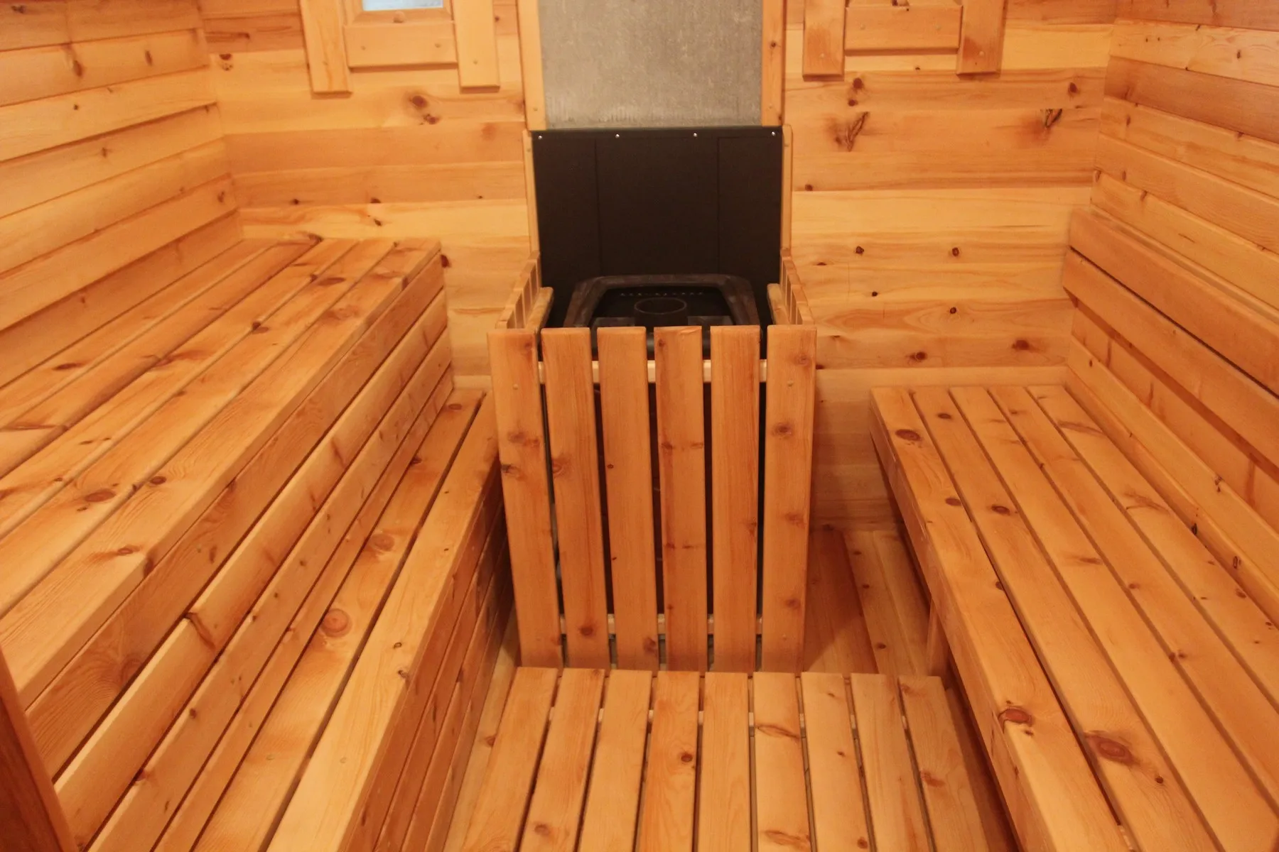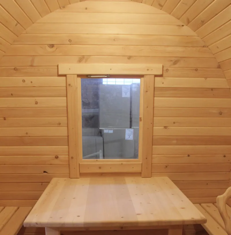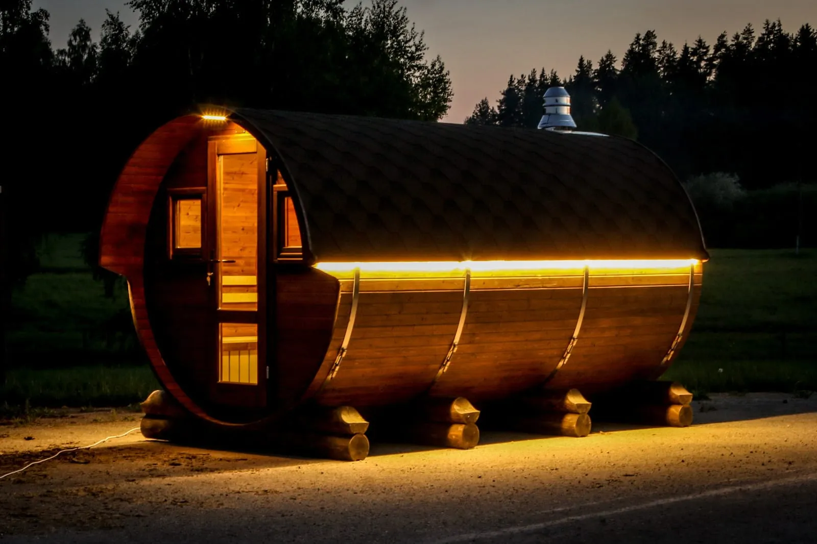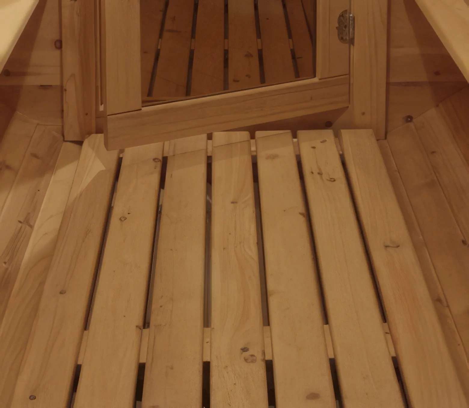 Это более просторная модель за счет увеличенной высоты потолков и ровного пола. В такой модели раздевалка совмещена с моечной. Тут установлен душевой поддон, вешалка, полочка и лавочка из кедра. В парильном отделении по обе стороны расположены двухуровневые открытые полки, печь находится между ними у дальней стены. Время растопки такой бани не превышает 30 минут. По вашему желанию баню-бочку можно укомплектовать козырьком, верандой и печью с внешней загрузкой, благодаря которой весь мусор во время топки остается на улице. Баня-бочка буханка не требует полноценный фундамент, поэтому при необходимости ее можно перенести в другое место.
