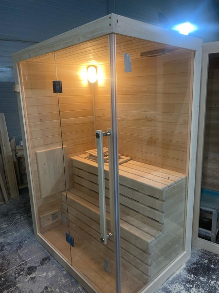 Закаленный цельностеклянный фасад с безрамной дверью является термостойким и придает конструкции легкость и обзорность. Можно добавить боковую стенку, как на образце 3D модели из термостекла за дополнительную плату. Дополнив кабину панелью из гималайской соли или можжевеловым панно с подсветкой вы получаете красивейший объект в интерьере. Финская сауна с электропечью подойдет, как для домашнего использования, так и для коммерции. Доставляется в разборном виде щитами, собирается по инструкции с помощью шуруповёрта.