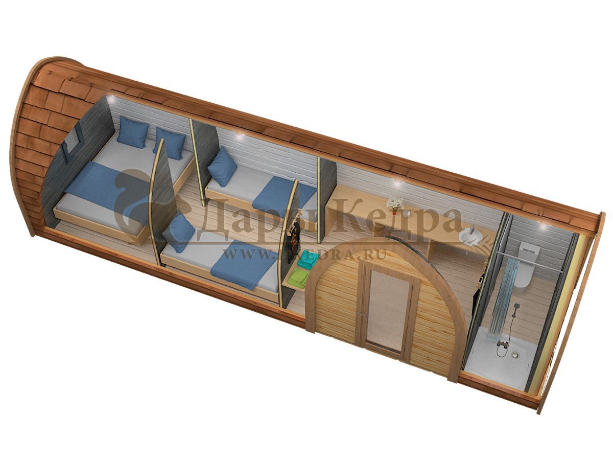 Кемпинг дом «Дуэт+» с боковым входом Такой кемпинг дом удобное и практичное решение для дачного использования или обустройства загородных баз отдыха. Увеличенные размеры и боковой вход со стеклянной дверью позволяют зонировать внутреннее пространство помещения. Домик включает в себя: Жилую зону с кроватями, столиком, вешалкой и полкой; Санузел с сантехникой, душевой поддоном и душевую стойку; Кемпинг дом изготовлен из хвойных пород древесины. Кровля из мягкой черепицы обеспечивают защиту от осадков.