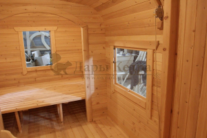 Домик с тремя помещениями подходит для дачного использования в теплое время года или обустройства загородных баз отдыха. Прихожая и кухня занимают одну комнату, в которой стоит стол из кедра. Две другие оборудованы четырьмя деревянными лежаками, по желанию их можно заменить на двуспальные кровати. Либо обустроить санузлом и душевой зоной. Для удобства пользования кемпинг дом можно укомплектовать верандой с лавочками или козырьком.