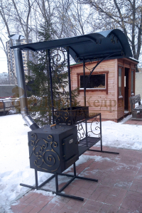 Мангал состоит из классической жаровни и печи под казан, поэтому разнообразие приготовленных блюд покорит любого. Все элементы изделия покрыты специальной жаропрочной краской, защищающей от коррозии и прогорания. Изделие также имеет столик, где можно разместить необходимые приборы для жарки, а под столиком находится полка для дров.