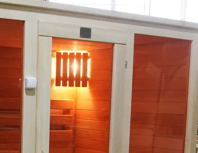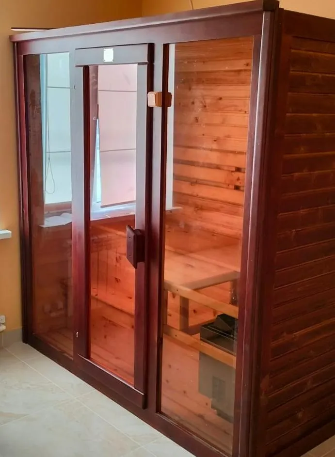 Это специально оборудованная кедровая кабина для прогрева тела человека сухим теплом. Воздух в таких парных не нагревается. Инфракрасные лучи воздействуют на тело, равномерно прогревая мышцы, суставы и органы. Керамические излучатели похожи на лампы, имеют высокую температуру нагрева, поэтому защищены противоожоговыми решетками. Тело человека в таких саунах нагревается интенсивнее. Работает кабина за счет электричества. Вместительная пятиместная инфракрасная сауна с керамическими излучателями подойдет для коммерческого использования.